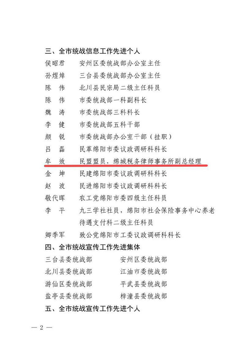 2020年2月10日,中共綿陽(yáng)市委統(tǒng)戰(zhàn)部發(fā)出《關(guān)于2019年度統(tǒng)戰(zhàn)工作綜合評(píng)價(jià)有關(guān)情況的通報(bào)》表彰全市統(tǒng)戰(zhàn)信息工作先進(jìn)個(gè)人,民盟綿陽(yáng)市委盟員、注冊(cè)稅務(wù)師、綿陽(yáng)市綿城稅務(wù)師事務(wù)所副總經(jīng)理牟效光榮上榜,是受表彰者中唯一的企業(yè)人員。